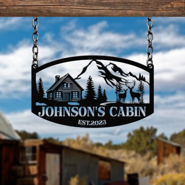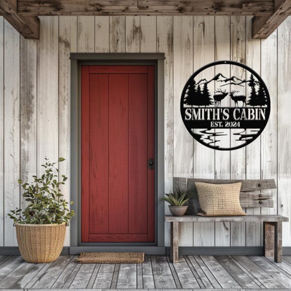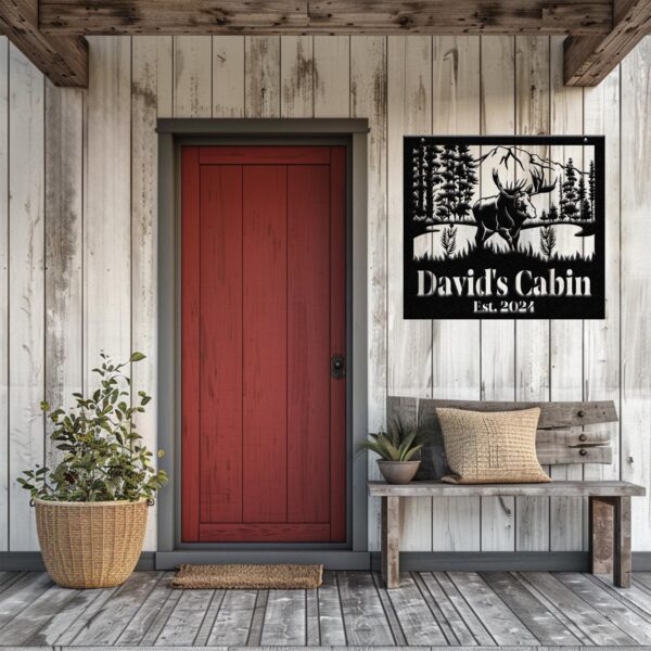 Custom Name Elk Cabin Sign, Outdoor Metal Elk Sign with Mountain, Hunting Gift, Metal Nature Wall Art Mountains Trees Wildlife Lover Gift
